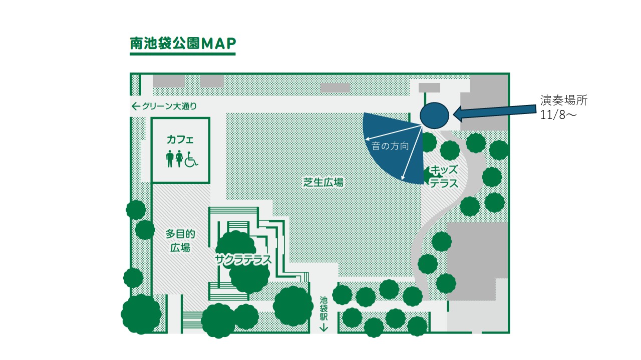 2025.11.07 〈変更〉南池袋公園の演奏場所について 南池袋公園での演奏につきまして、「サクラテラス」上で開催を行っておりましたが、諸般の事情により11/8(土)以降、南側の卓球台前とさせていただきます。 何卒よろしくお願いいたします。